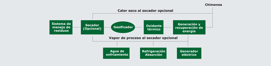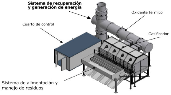 El sistema RGETUSA integra cinco componentes principales para convertir los desechos en energía y en ceniza inerte residual. El sistema es modular, diseñado para acoplar la escala de cada aplicación en particular y expandible para enfrentar un futuro crecimiento. Los cinco componentes principales son: 1) Sistema de alimentación y manejo de residuos: El sistema de alimentación y manejo de residuos está diseñado para entregar los desechos al gasificador. La alimentación dentro del gasificador es realizada por prensas hidráulicas. Uno por cada celda del gasificador. 2) Sistema de secado: El sistema de secado (si es necesario) recibe los desechos y usa el calor del sistema de recuperación y generación de energía para secarlo. En algunos casos, mezclar los desechos primarios con otro, más seco, reducirá los requerimientos de secado y aumenta el desempeño general del gasificador. 3) Gasificador: Los gasificadotes están disponibles en modelos con uno, dos, tres o cuatro celdas, y trabaja a 28mmBtu/hr. Gasificadores adicionales pueden ser instalados para mayor cantidad de residuos. El proceso de gasificación tiene lugar en una cámara de gasificación primaria de cerámica reforzada. 4) Oxidante térmico: Otro componente del propietario, el oxidante térmico recibe el gas de síntesis producido por el gasificador y tiene tres funciones. El oxidante térmico (1) convierte el gas de síntesis producido por el gasificador en calor útil para la recuperación de energía, (2) controla y elimina los contaminantes potenciales y (3) elimina los olores. 5) Sistema de recuperación y generación de energía: El sistema de recuperación y generación de energía usa el gas de escape caliente del oxidante térmico en un generador de gas de síntesis y recuperación de calor (HRSG) para producir gas de síntesis. El gas luego puede ser empleado directamente para procesos y aplicaciones térmicas, o puede ser usado para generar energía. En el caso de residuos húmedos como lodos de las plantas de tratamiento de aguas residuales, el gas puede ser usado en ambos casos, para generar electricidad y proveer calor para secar el lodo entrante. El calor también puede ser utilizado para calentar los tanques de digestión del cliente.